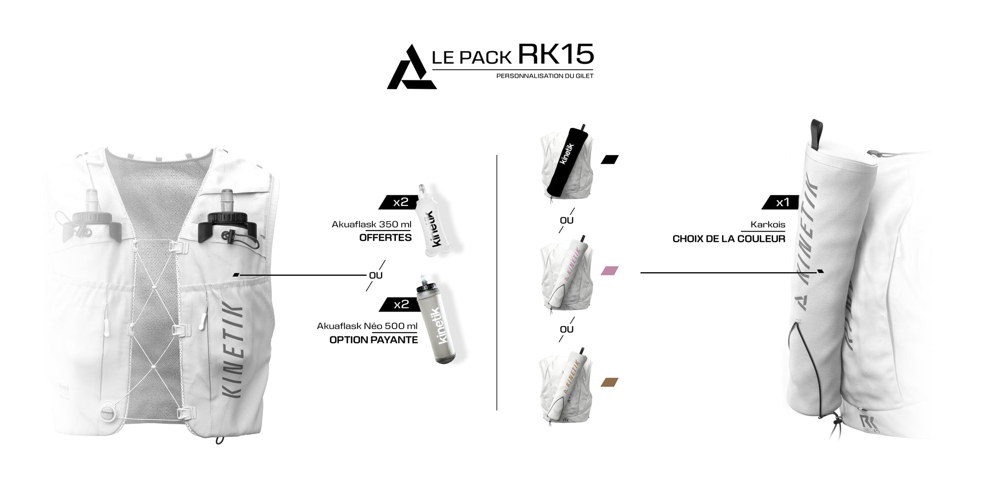 Le RK15 est livré avec un carquois amovible, pratique pour le rangement de vos bâtons de trail, ainsi que deux flasques souples de 350 ml ou 500ml pour rester hydraté à chaque instant.